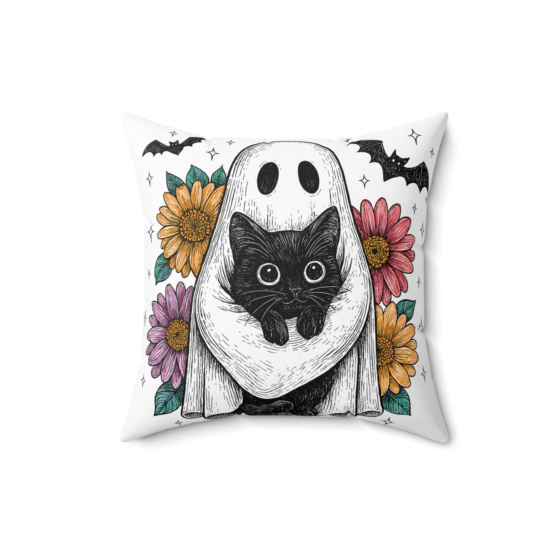 Add a touch of whimsical charm to your living space with this delightful square pillow, perfect for cat lovers and those who enjoy a blend of playful and spooky vibes. Featuring a charming ghost cuddling a cute black cat amidst vibrant flowers, this pillow brings joy and warmth to any room. It's an ideal accessory for Halloween decorating, cozy nights, or simply to uplift your home aesthetics year-round. Great for any age, this pillow is a fantastic gift for birthdays, housewarmings, or as a treat for yourself!