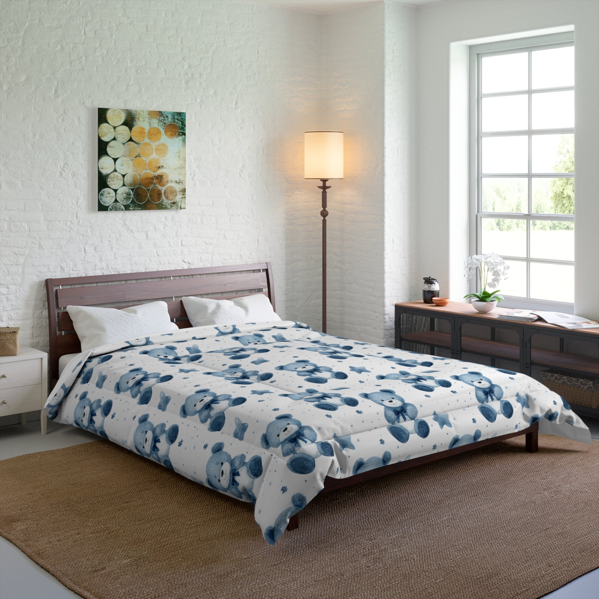 Enhance your bedroom decor with this charming comforter that radiates warmth and coziness. Featuring a delightful pattern of teddy bears against a crisp white background, this comforter brings a playful vibe, making it perfect for children's rooms or as a cheerful addition to your own space. Lightweight and incredibly soft, it offers the perfect blend of comfort and style, ensuring restful nights and bright mornings. Ideal for those who cherish a sense of whimsy and fun, this comforter seamlessly fits into family spaces or as a thoughtful gift for baby showers, birthdays, or holiday celebrations. Whether you’re aiming to create a cozy sanctuary or looking for the perfect present, this comforter makes every occasion feel special.