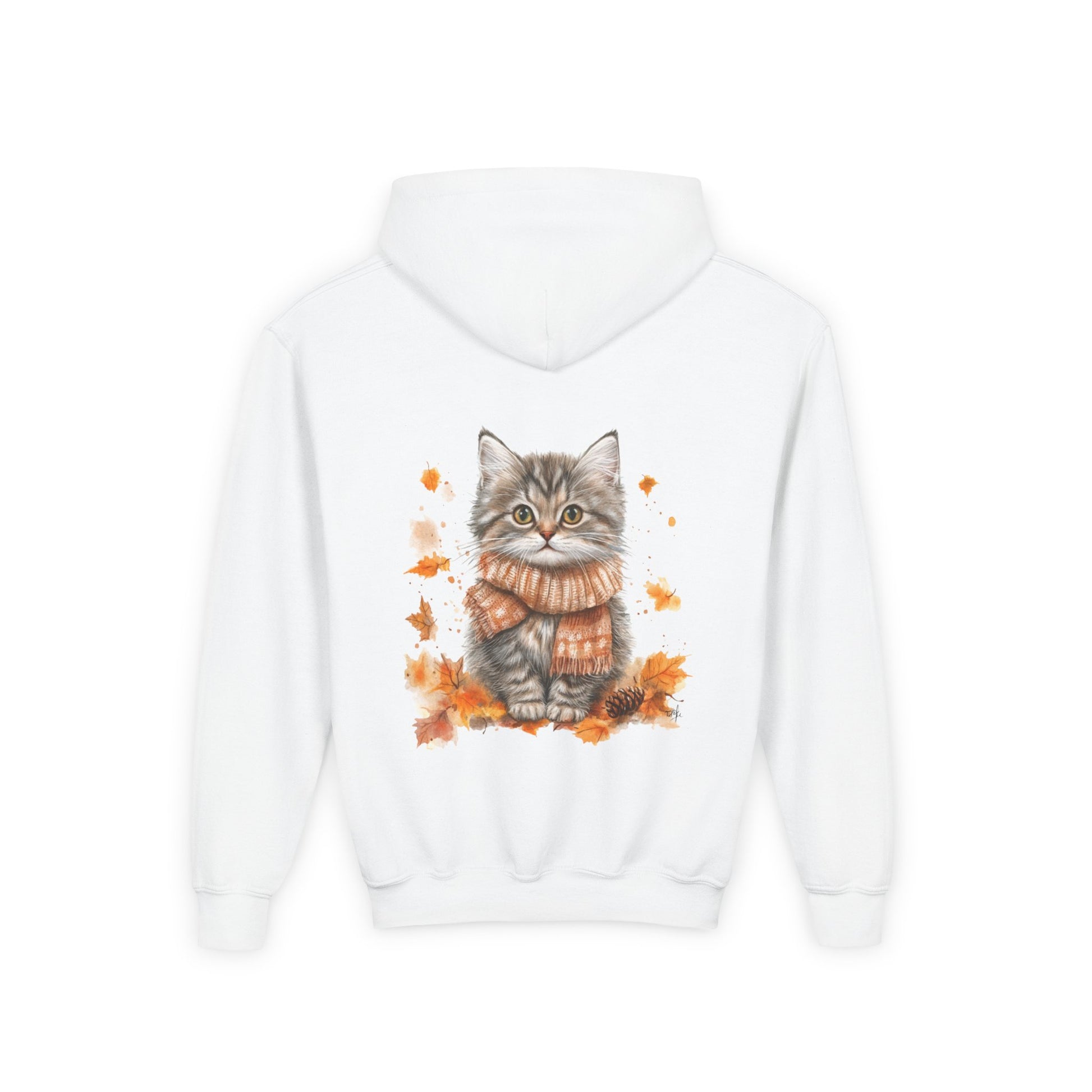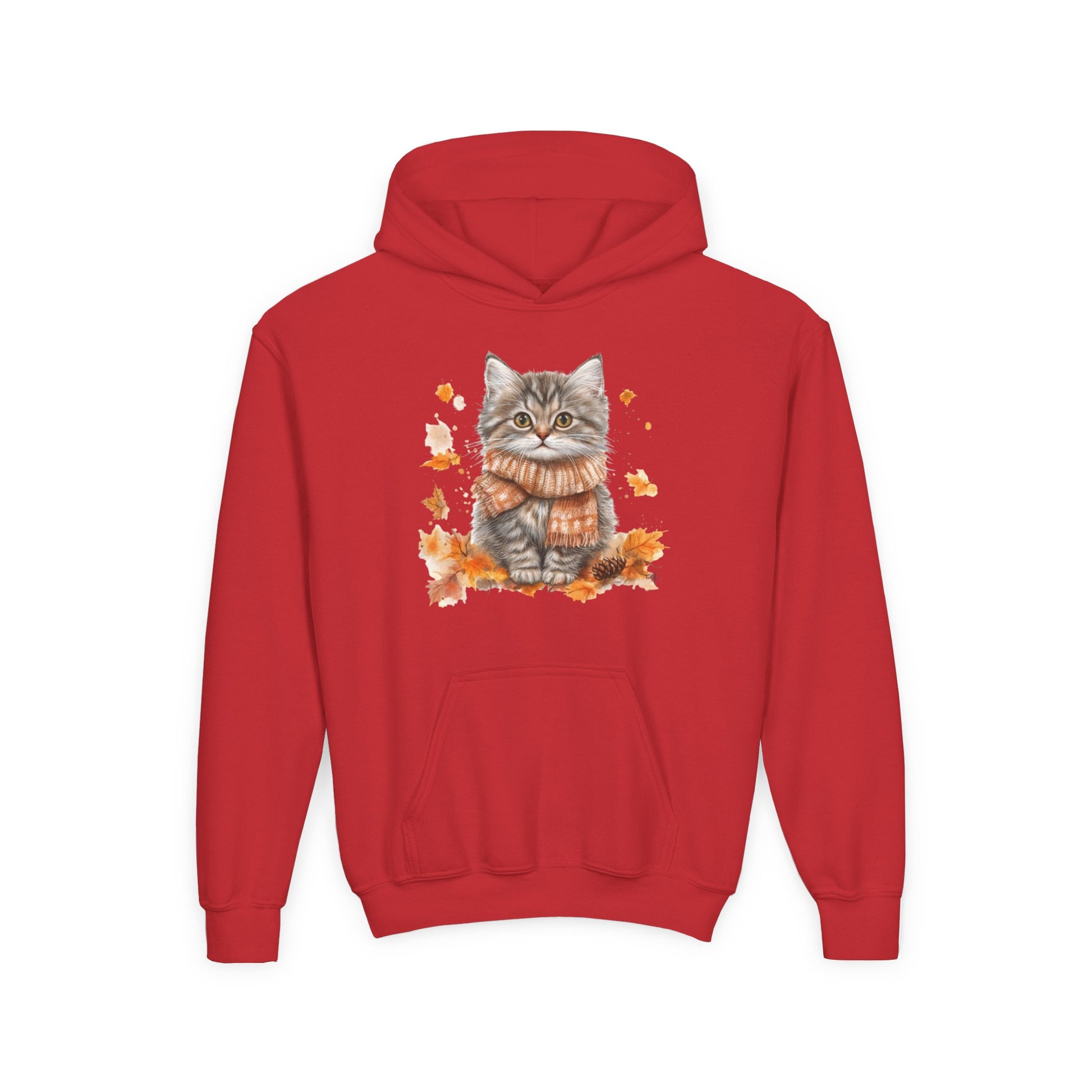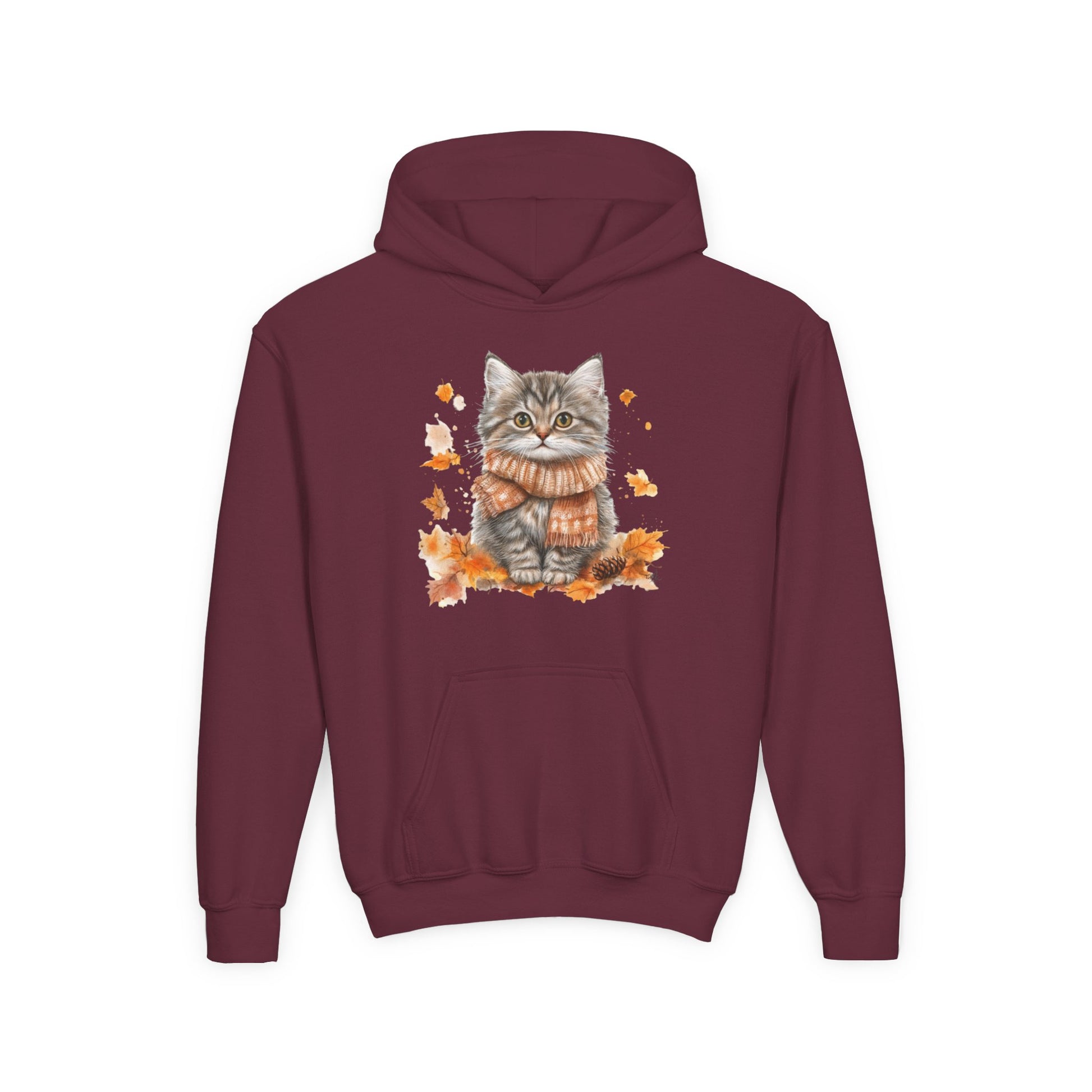 Embrace the cozy days and festive spirit with this charming Youth Heavy Blend Hooded Sweatshirt featuring a delightful feline design. Perfect for kids, this sweatshirt adds warmth and style to their wardrobe. The friendly cat illustration, draped in a stylish scarf amidst autumn leaves, creates a playful atmosphere that resonates with the comfort of home. Ideal for casual outings, school wear, or holiday gatherings, this sweatshirt is sure to be a favorite for birthdays, Halloween, or back-to-school celebrations. Lightweight yet warm, it fits comfortably into everyday life, keeping your little ones snug and fashionable throughout the seasons.