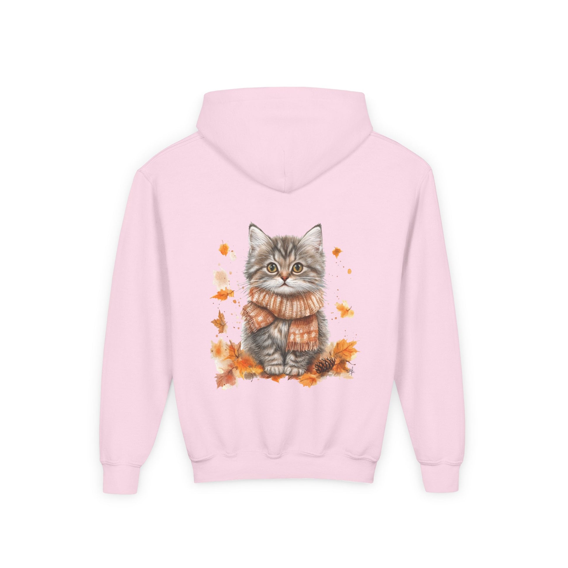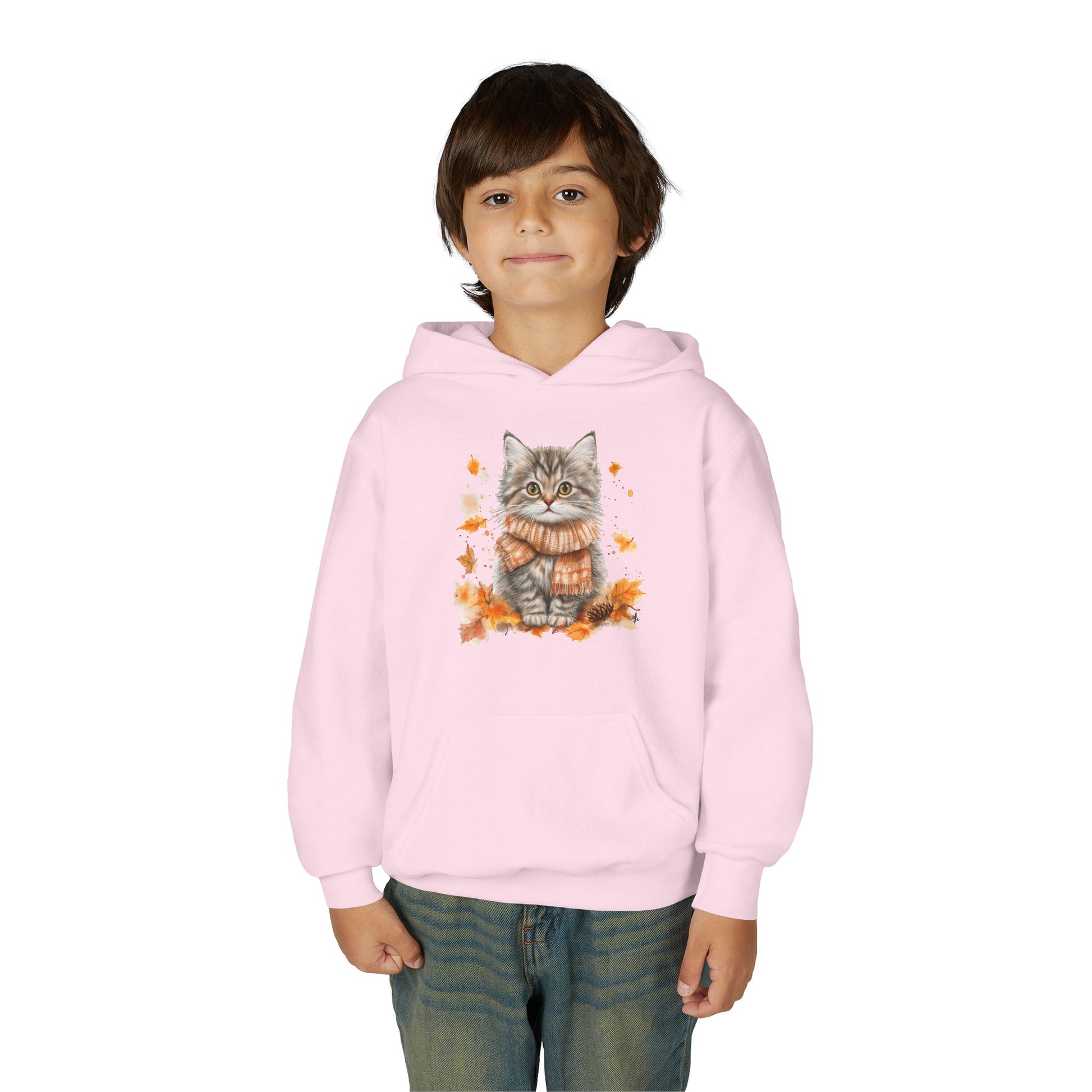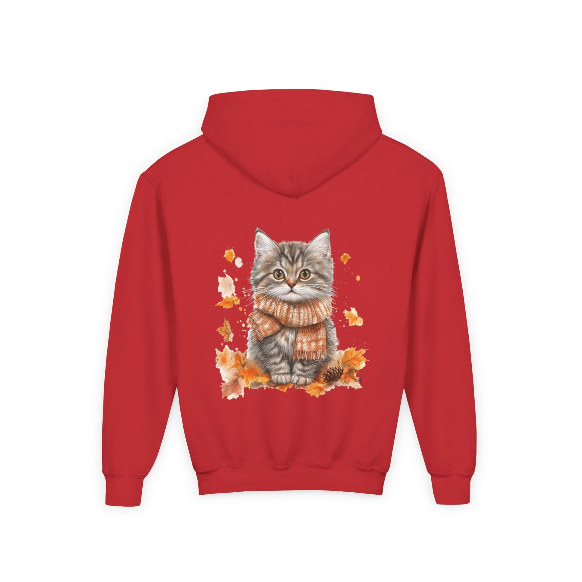 Embrace the cozy days and festive spirit with this charming Youth Heavy Blend Hooded Sweatshirt featuring a delightful feline design. Perfect for kids, this sweatshirt adds warmth and style to their wardrobe. The friendly cat illustration, draped in a stylish scarf amidst autumn leaves, creates a playful atmosphere that resonates with the comfort of home. Ideal for casual outings, school wear, or holiday gatherings, this sweatshirt is sure to be a favorite for birthdays, Halloween, or back-to-school celebrations. Lightweight yet warm, it fits comfortably into everyday life, keeping your little ones snug and fashionable throughout the seasons.