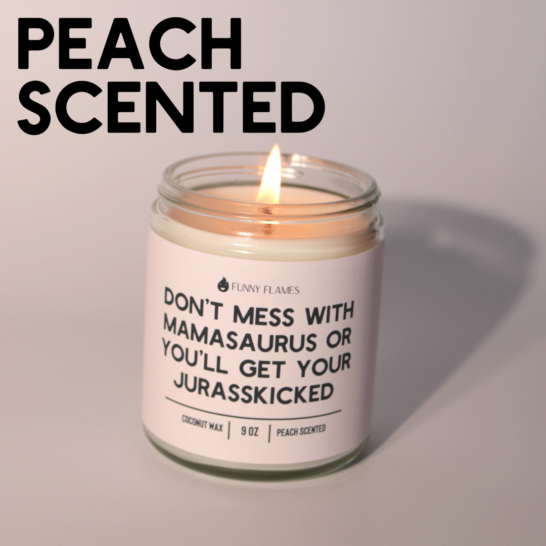 Illuminate your mom's world with our "Don't Mess with Mamasaurus" candle, radiating the sweet scent of juicy peaches. This candle pays tribute to the fierce and loving mamasauruses out there who protect their young with unwavering devotion. Light it up, and as the peachy aroma fills the air, remind your mom that she's a force to be reckoned with and the heart of your prehistoric family. Just like this candle, she's both warm and strong, creating a nurturing oasis in your life that's impossible to resist
