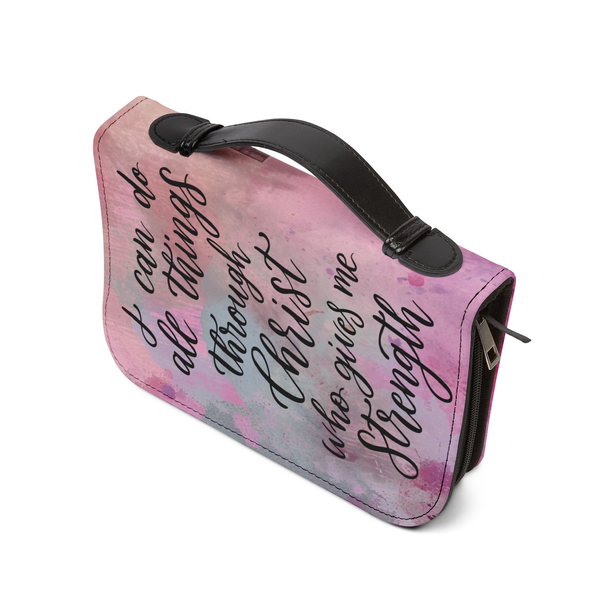 This beautifully designed Bible Cover is perfect for those who cherish their faith and want to keep their Bible safe and stylish. Made from durable PU leather, it gives you the appearance of genuine leather while being eco-friendly. The artistic pink watercolor design featuring uplifting scripture adds a vibrant touch to your spiritual journey. It's perfect for everyday use, church gatherings, or as a thoughtful gift for loved ones on occasions like Christmas, Easter, or Baptism. This Bible cover is designed for anyone looking to express their faith with elegance and practicality, making it a wonderful addition to your daily life or a cherished gift for a friend or family member.