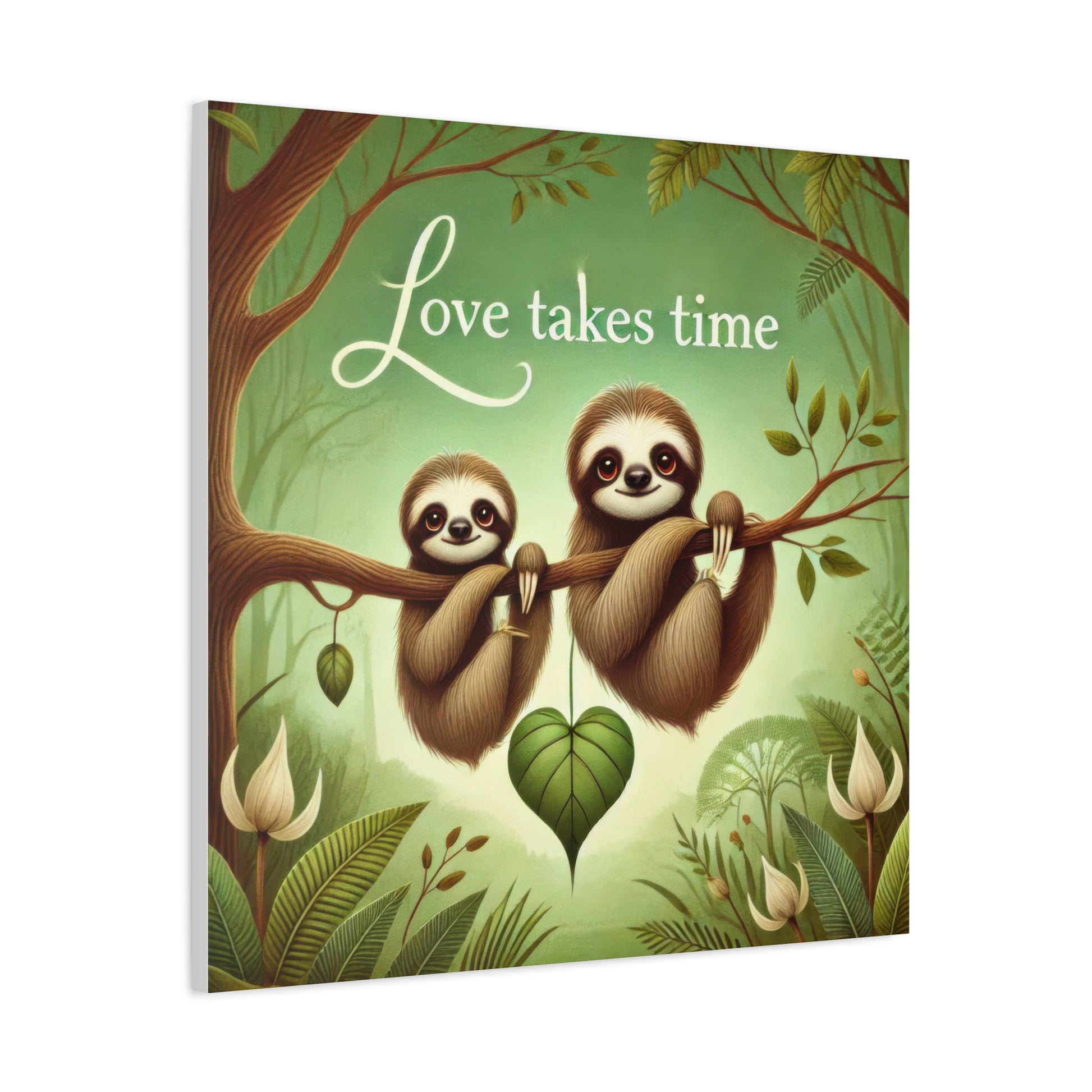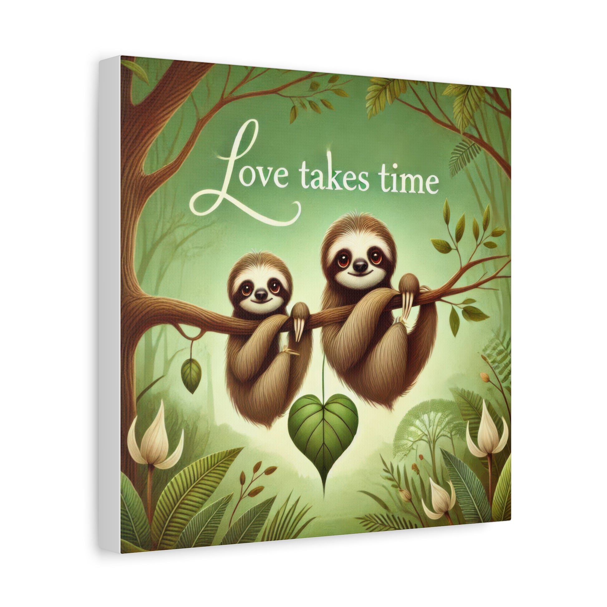 Transform your space with this charming stretched canvas art piece featuring two adorable sloths, a delightful reminder that 'Love takes time.' Perfect for any room, this canvas brings a whimsical touch to your decor, creating a peaceful and joyful atmosphere. Its vibrant colors and enchanting design make it a wonderful gift for nature lovers, families, or friends celebrating love and connection. Ideal for occasions like anniversaries, birthdays, or just because. Hang it in your living room, nursery, or office to inspire smiles and warmth every day.